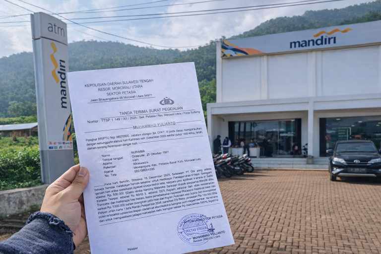 MOROWALI UTARA — Seorang warga Desa Onepute, Kecamatan Petasia Barat, Kabupaten Morowali Utara, melaporkan dugaan pembobolan rekening bank ke pihak Kepolisian Sektor (Polsek) Petasia. Laporan tersebut telah diterima secara resmi dan tercatat dalam tanda terima surat pengaduan bernomor TTSP/149/XII/2025.