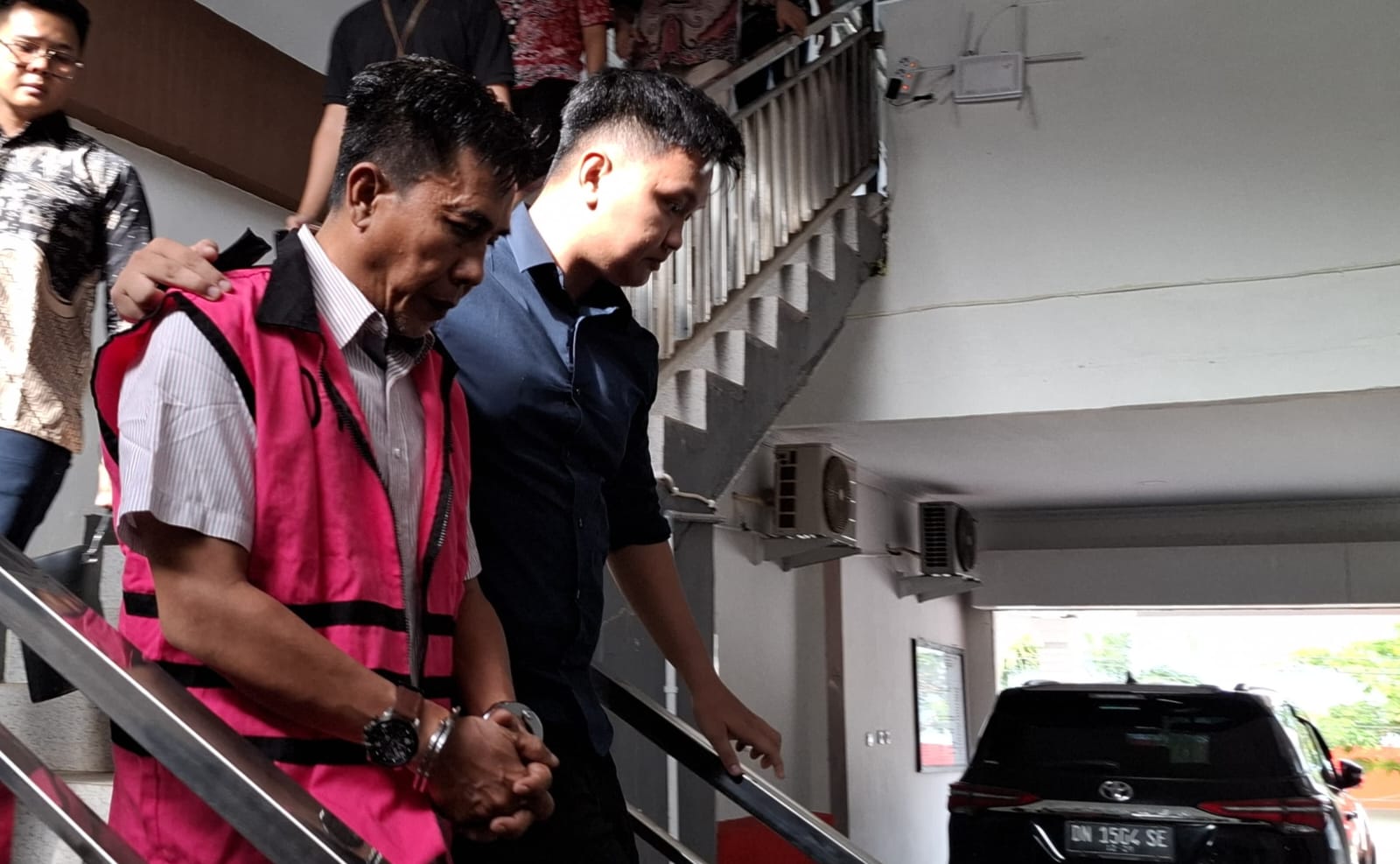 Iwan Ibon digiring kejaksaan Negeri Morowali Utara, ia tampak menerima “Baju Baru” dan dengan tangan diborgol dibawa ke mobil tahanan.